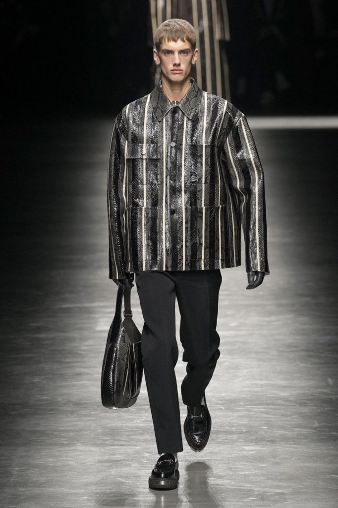 Gucci’s legacy intertwines with its iconic loafers, a design that not only etched its place in history but also graces MoMa exhibitions as a pinnacle of design mastery. While the previous women’s runway elevated the classic loafer with a substantial platform, this collection introduces the masculine rendition of the Gucci loafer, embracing the aesthetics of the timeless Creepers. Originating during World War II, Creepers are renowned for their treaded and robust soles paired with a more formal upper. Gucci’s iconic loafer mirrors this style, undergoing a transformation across a myriad of textures, intricate details, and diverse proportions, showcasing a contemporary evolution of a timeless classic.