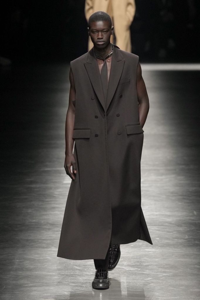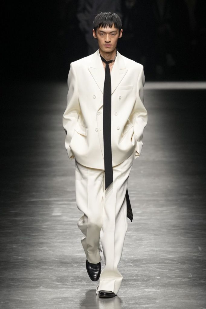 A subtle yet discerning detail that might escape casual observation lies in the trousers, specifically their meticulously tailored fit. Amidst the runway’s soft, airy, and draped proportions on some models, a significant majority embraced slim-fit trousers—neither overly tight nor loose, but impeccably contoured. This nuanced choice echoes De Sarno’s commitment to balance and moderation in tailoring, hinting at a resurgence of precisely measured and subtly cropped trousers, gracefully concluding just above the ankle.