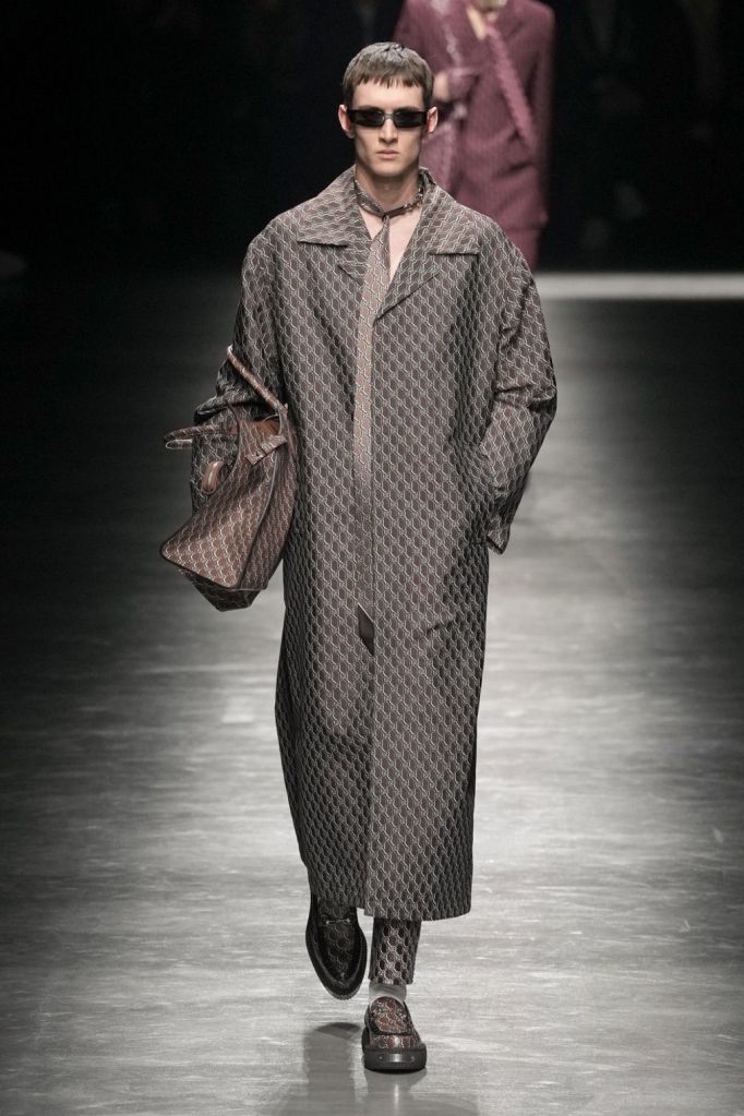 Gucci’s timeless monogram takes on a fresh identity under Sabato De Sarno’s direction, appearing on garments and bags in a transformed state—reduced, reticulated, and endowed with a shadow effect that adds dimension. Departing from the conventional GG monogram, this discreet motif mirrors fabric textures and abstract geometric patterns, embodying De Sarno’s cohesive, precise design ethos. During the runway spectacle, the new monogram envelops entire ensembles in varying hues, particularly in shades of gray and Ancora Red, foreshadowing its widespread integration into the upcoming men’s collection. The dawn of a new minimalistic era is unmistakably upon us.