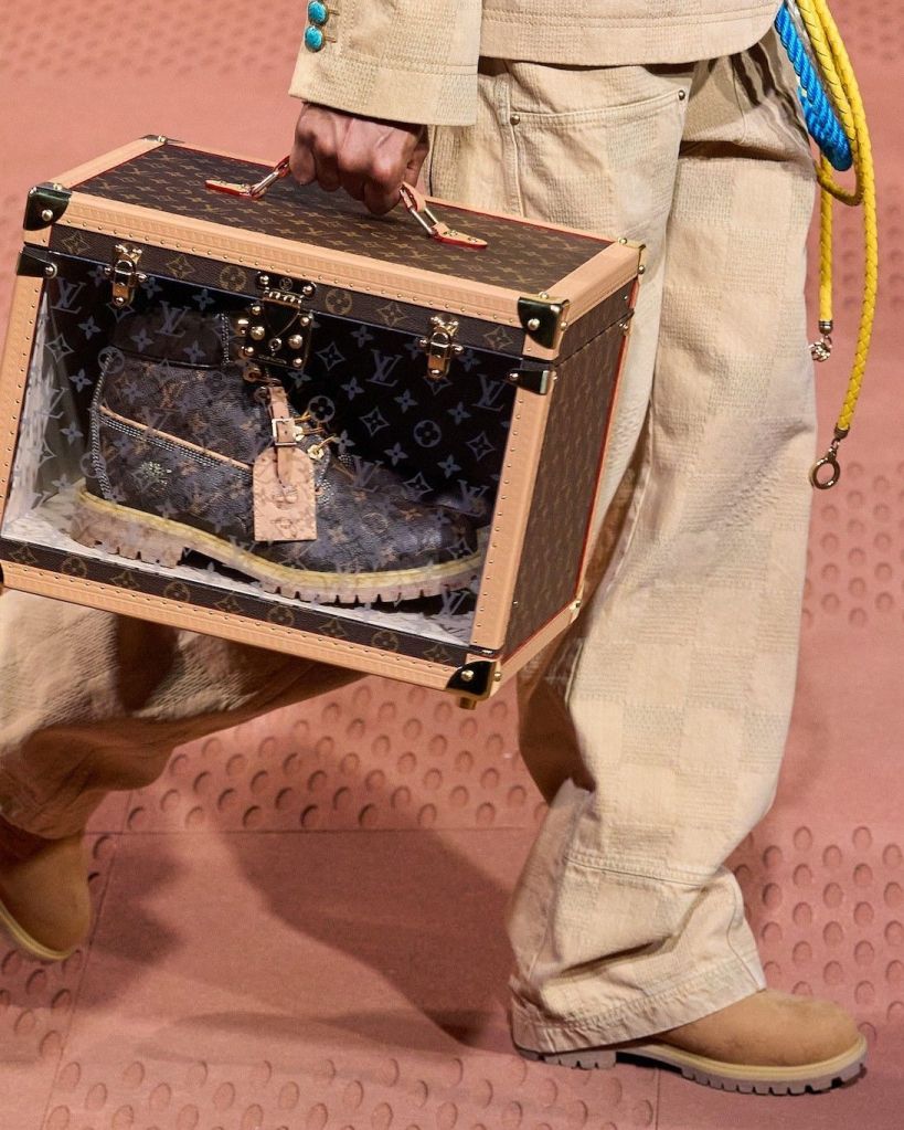 In the same year, as part of Louis Vuitton’s SS19 collection, Virgil Abloh unveiled the LV Creeper Ankle Boot – a piece crafted in beige calfskin suede. This design, essentially an ultra-luxurious rendition of Timberlands, featured gold chains, a more tapered toe, and the brand’s monogram adorning the padded ankle insert. Timberland’s influence had already left its mark on the Louis Vuitton runway, a testament to its enduring impact and role in high fashion.
