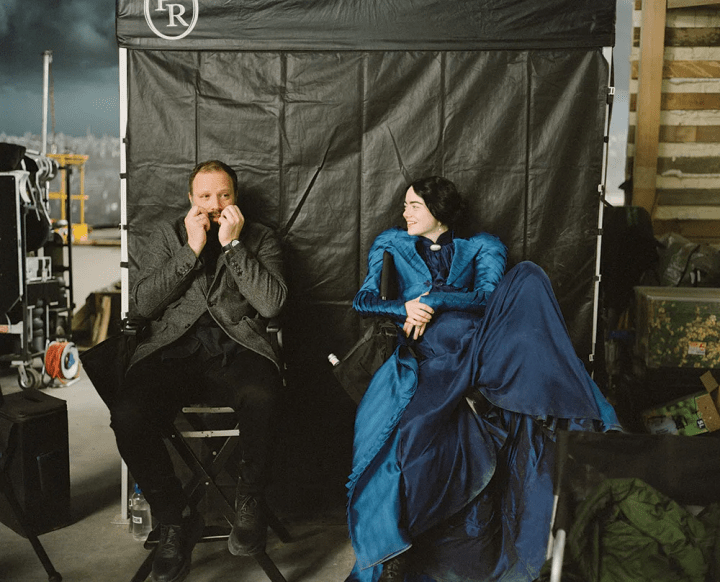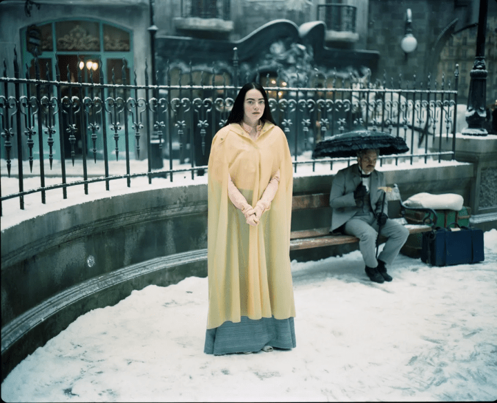 Notably, Waddington introduces an anachronistic clash between fabric and form by incorporating latex into the creation of a striking yellow raincoat. This inventive touch draws inspiration from Victorian-era condoms, infusing a layer of irony into a pivotal turning point in the film’s plot. In this nuanced exploration of Bella’s journey, the interplay between clothing, colors, and unconventional materials serves as a visual tapestry, capturing the essence of her empowerment and defiance in the face of societal norms.