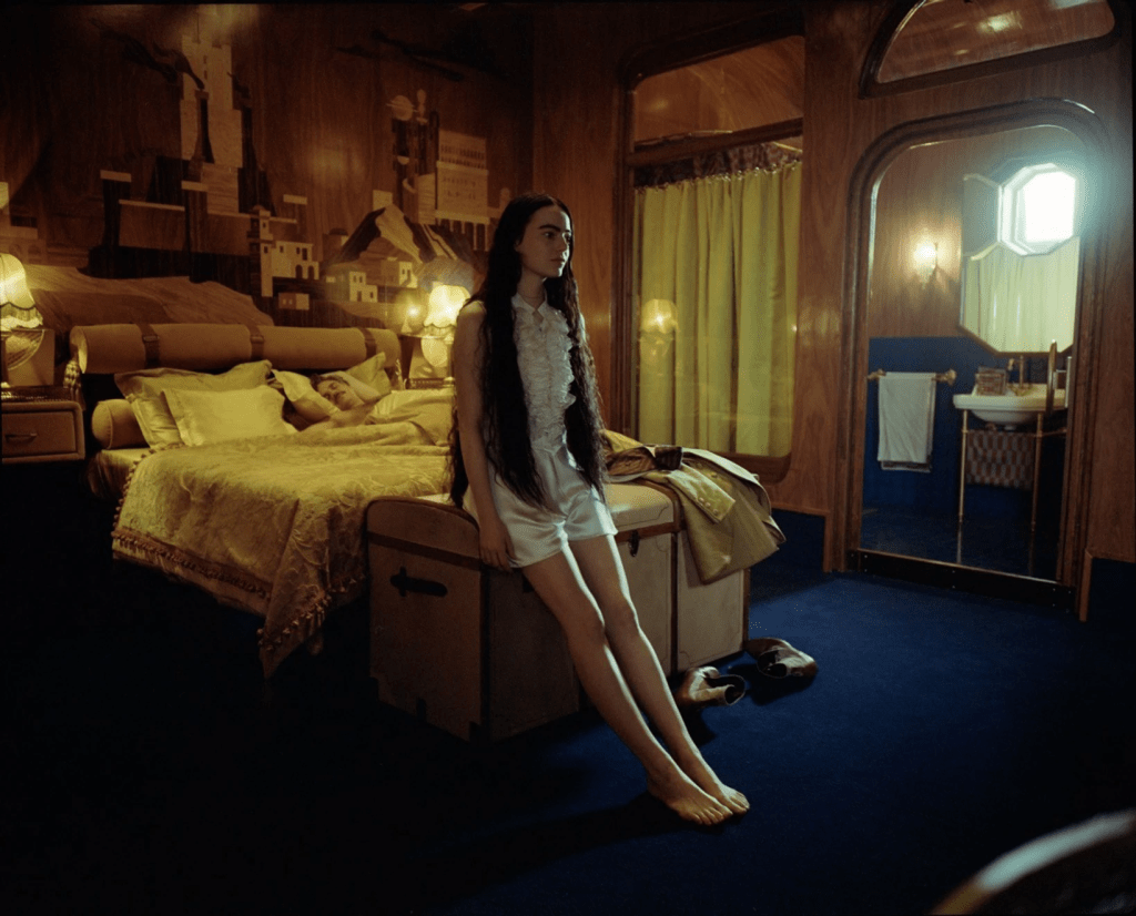In the film’s early pages, Bella emerges as an infant figure, draped in nightgowns and white baby doll dresses, whimsically navigating the rooms of her London upbringing. A bustle cage, reminiscent of a mermaid’s tail, captures the playful essence of the era’s silhouettes. Bare legs, bare feet, and cascading loose or braided hair embody her innocence.