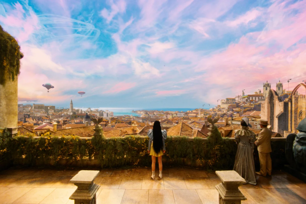 The transition from black and white to a burst of color coincides with Bella’s arrival in Lisbon, where freedom and sexuality unfurl before her. Freed from the constraints of a governess dictating her attire, Bella ventures into the city clad in canary yellow shorts and a frilly white blouse. Waddington’s ingenious touch manifests in ankle-length white boots inspired by Courrèges’ space-age aesthetic of the ’60s. The top and shorts, termed “modesty pieces” in the Victorian era, defy societal norms, covering skin deemed provocative even in ankle exposure.