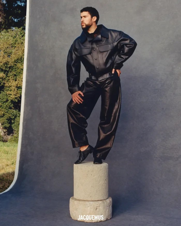 Captured through the lens of Theo De Gueltzl and expertly styled by Katie Burnett, Bad Bunny takes on various personas, showcasing the diverse range of sculptural menswear from the collection. From the sophistication of a streamlined grey suit to the boldness of a strapless black jumpsuit, each ensemble is a masterpiece in its own right.