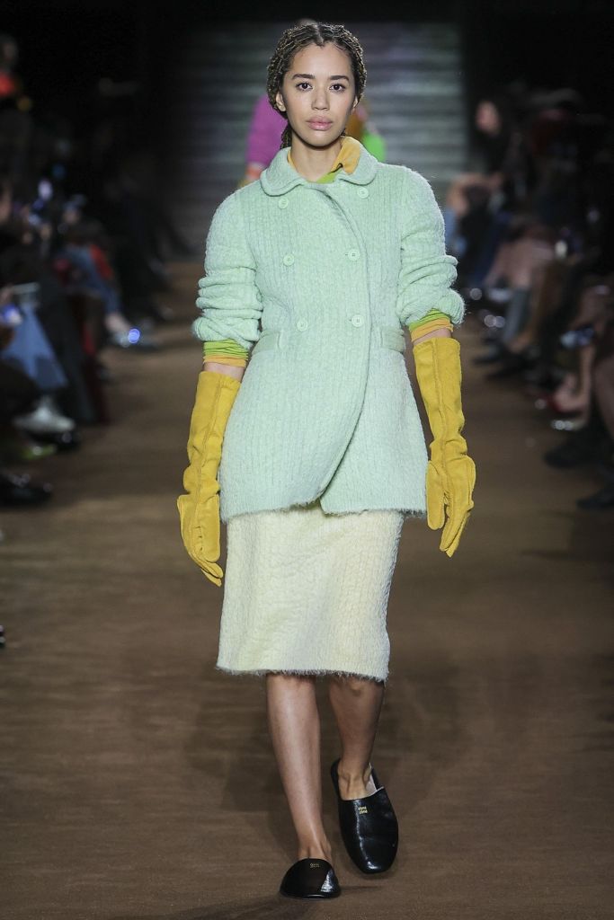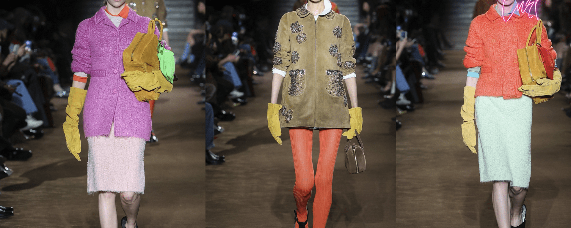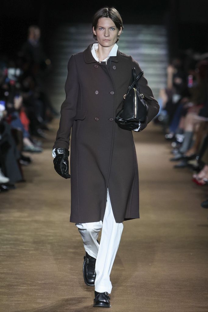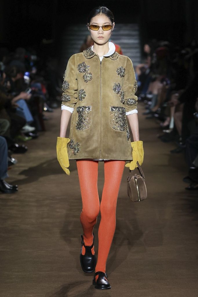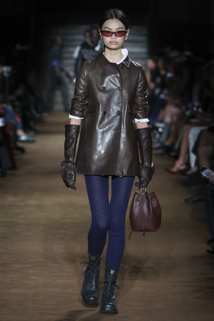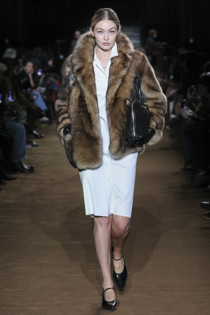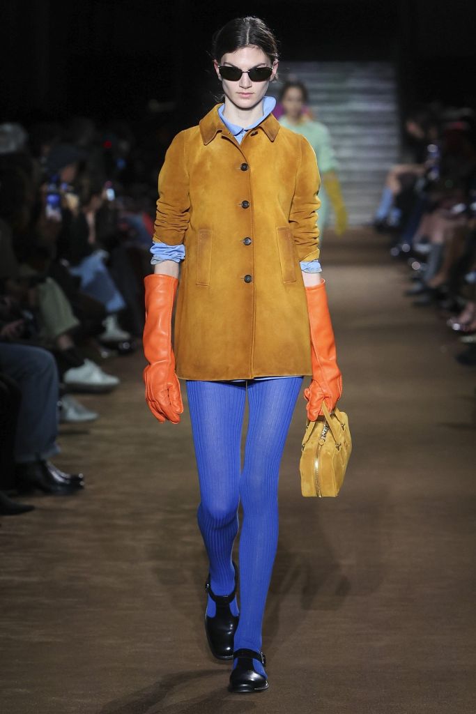 The Miu Miu woman, transcending the label of a mere “girl,” is rebellious yet comfortable. While her outfits draw from classic bourgeois dressing, there’s always an element challenging the order. This may manifest in goalkeeper boots and gloves paired with skirts and suits or a disheveled shirt collar peeking out from a coat adorned with pearls. Conversely, a more sporty or subdued ensemble finds its flair through an elegant touch, such as the incorporation of fur. Notably, the runway this year featured the iconic Kristin Scott-Thomas, Angela Molina, and other mature models, reinforcing Miu Miu’s ability to infuse sophistication and rebellion into every facet of its unique fashion narrative.
