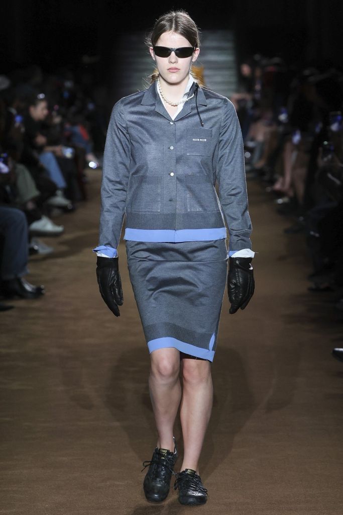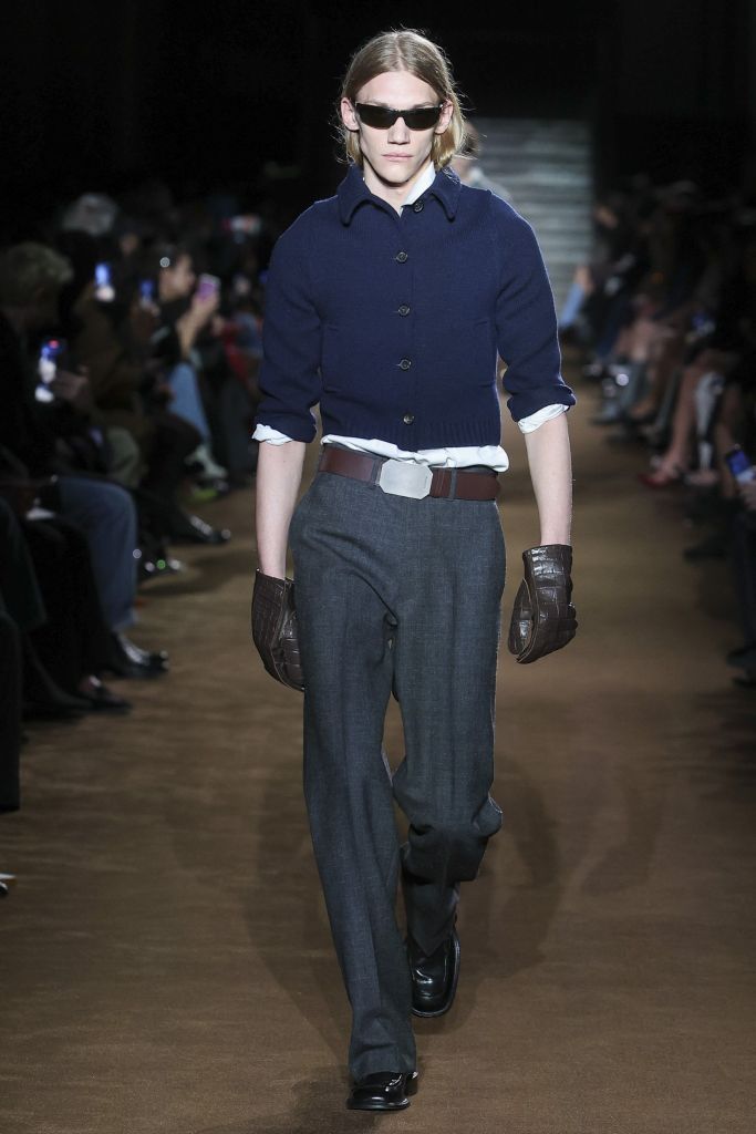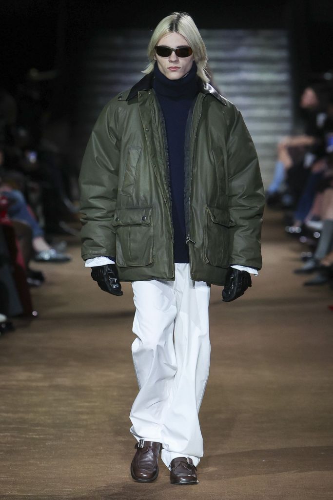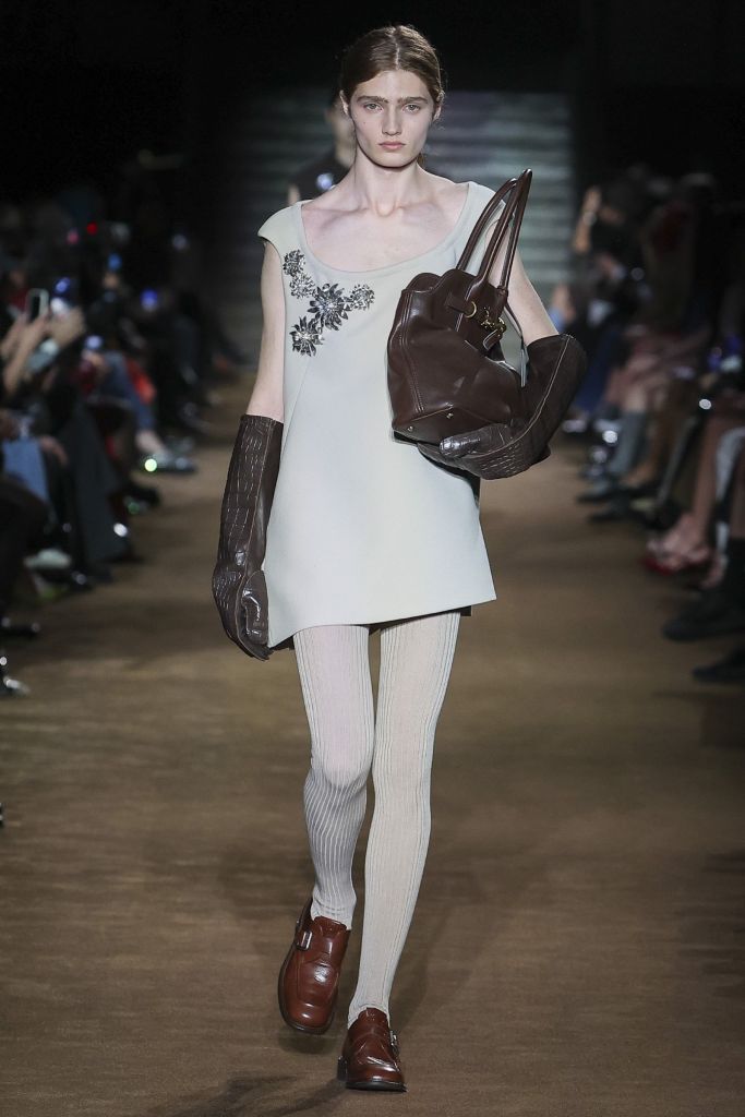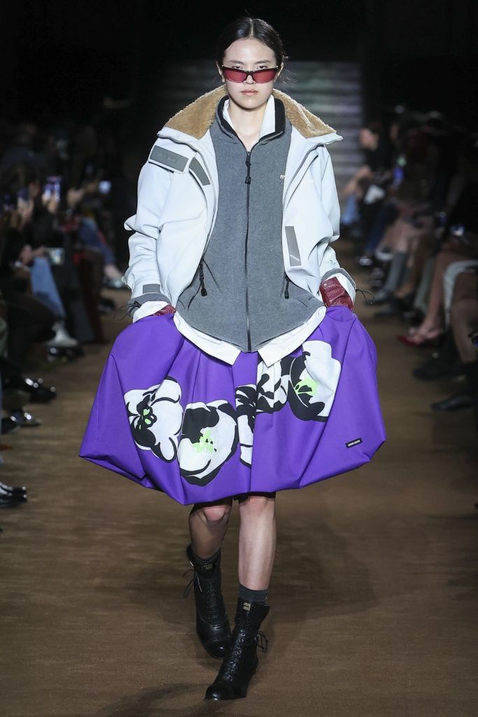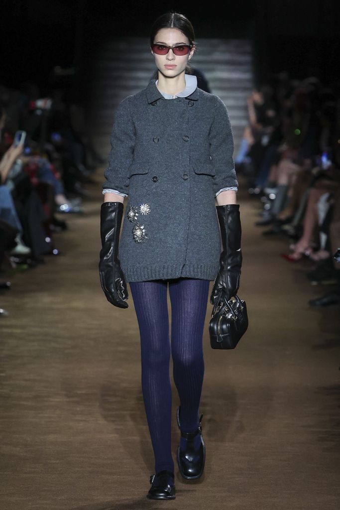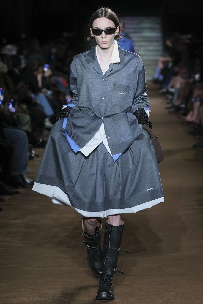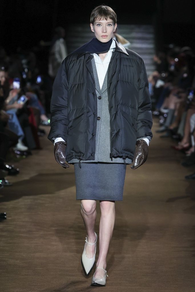 The brilliance of Miu Miu lies in the creation of an “ideal” wardrobe that mirrors life’s various stages. From childhood-inspired clothes with a nod to the past in construction and snug fit to adulthood pieces evoking subsequent decades, the brand crafts a narrative that transcends time. Despite the apparent vintage influences, this show is far from being a mere ode to the past. Merging contemporary and démodé, the runway showcased unexpected combinations, like pairing a skirt with a gray fleece jacket under an aviator-style puffer cut. The juxtaposition of very short jackets with blouses falling to thigh height evokes the peplum tops of the early 2000s, complemented by tight, low-rise denim subtly nodding to the Indie Sleaze era. Miu Miu once again proves its mastery in blending the old with the new, creating a fashion narrative that is both timeless and avant-garde.