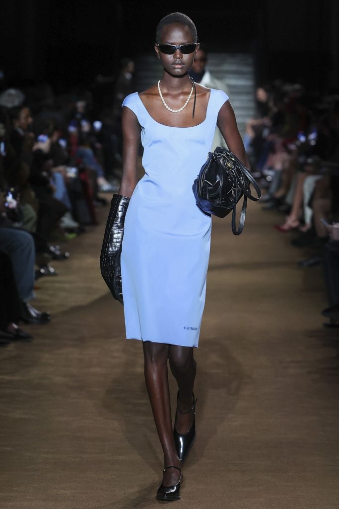 Miu Miu’s post-modern Sixties aesthetic is a reinterpretation marked by disciplined shapes and colors, shedding its original naivety for a deliberate attitude. The collection masterfully weaves in a strong 90s influence, evident in the controlled color palette, the austere demeanor of jackets and shirts, and the striking jet-black sunglasses. Through the deliberate juxtaposition of garments from different eras and destinations, the collection captures the universal tension between past and present, echoing the way we dress as adults with tastes shaped in childhood.