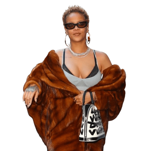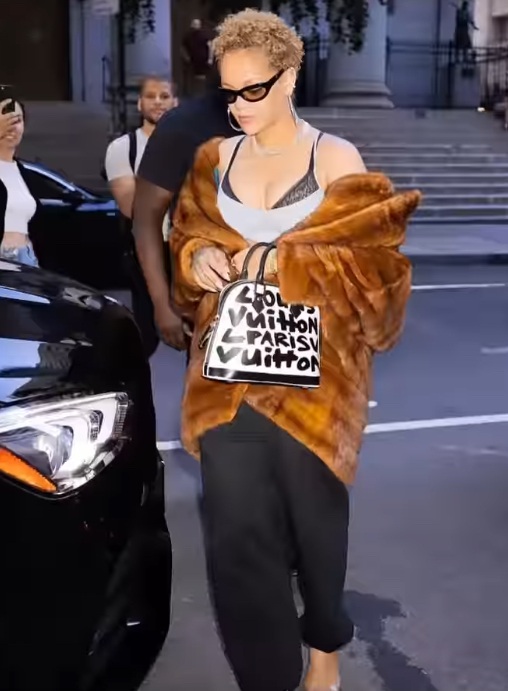 Rihanna accessorized with a vintage 2001 Louis Vuitton X Stephen Sprouse Alma MM bag, a top featuring a black lace peekaboo bralette, oversized black pants, nude sandals, and a brown maxi fur coat—quite surprising for June. Extra-large hoop earrings and Kaleos cat-eye sunglasses completed her look. We’ll have to wait and see if Rihanna will continue to embrace her natural hair and if rising temperatures will prompt her to leave the fur behind.