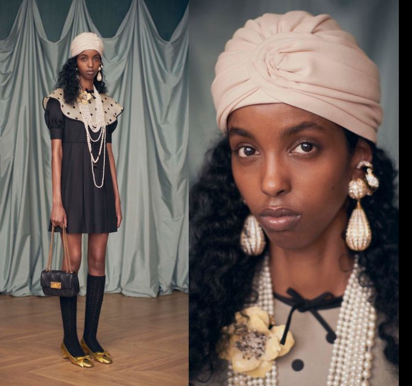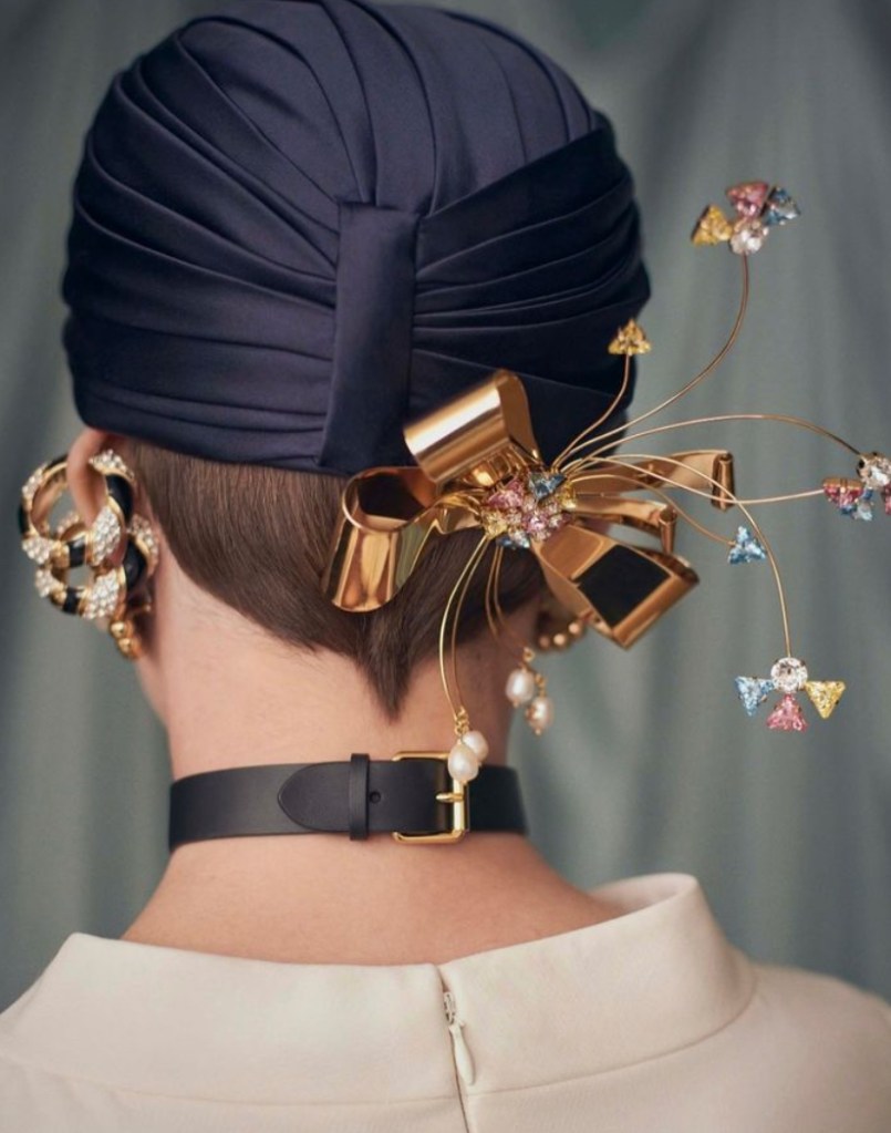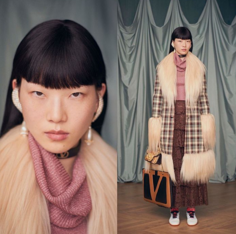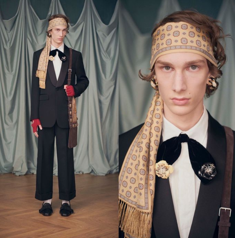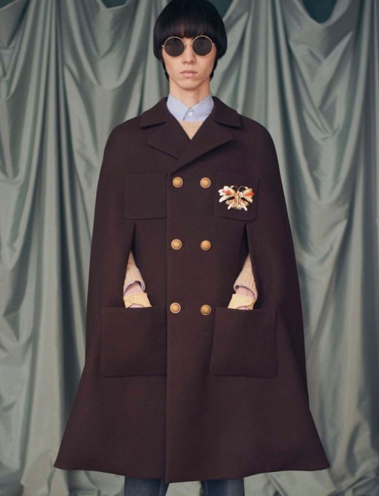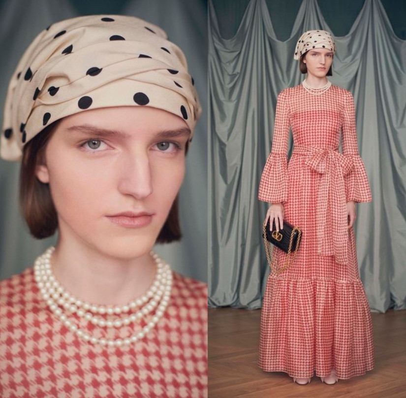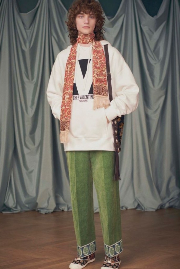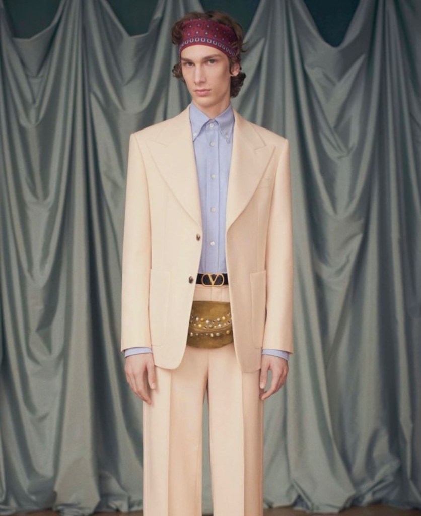 More than a teaser, Michele’s collection offers a deep dive into Valentino’s stylistic heritage. Highlights include belted ivory peacoats with V-motifs on pockets and cropped jackets paired with tailored dresses, paying homage to Valentino Garavani’s 1968 white collection. These elegant looks are styled with turban hats and pearls, adding Michele’s cinematic flair. Gender-fluid elements bring modernity to classic silhouettes, with male-presenting models in bell-shaped capes and ruffled turtlenecks, while striking looks like 1970s-style bell-bottom suits are worn by women.