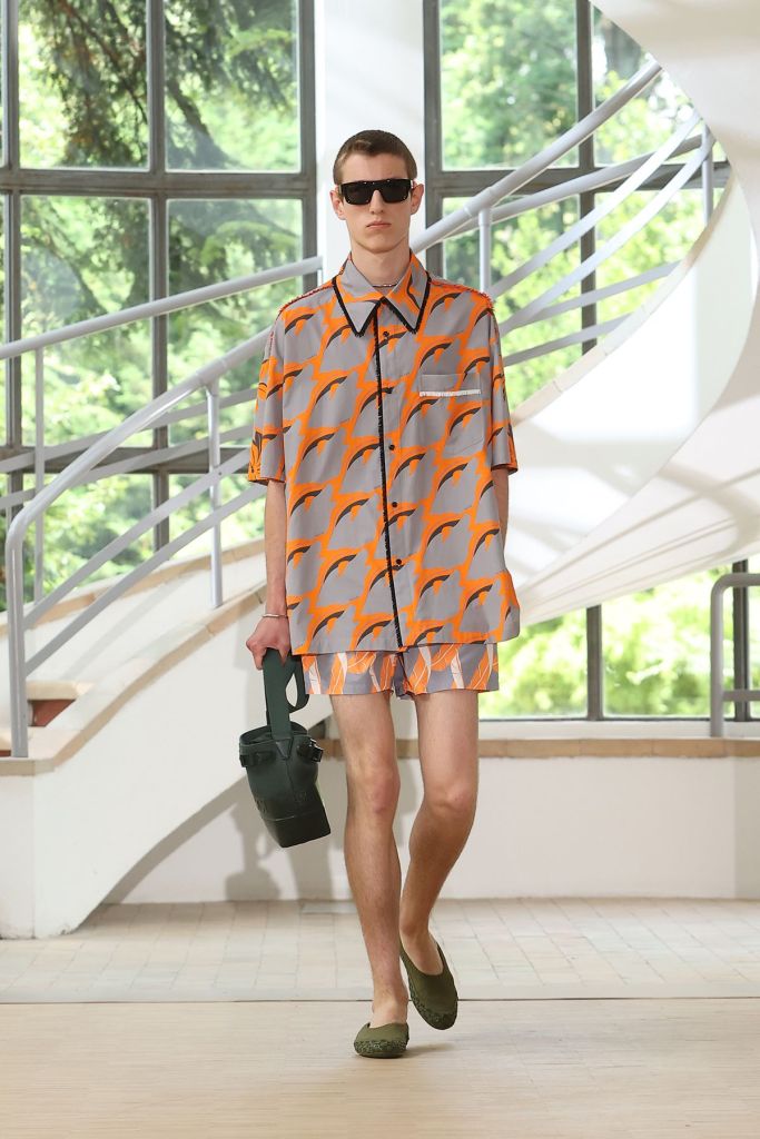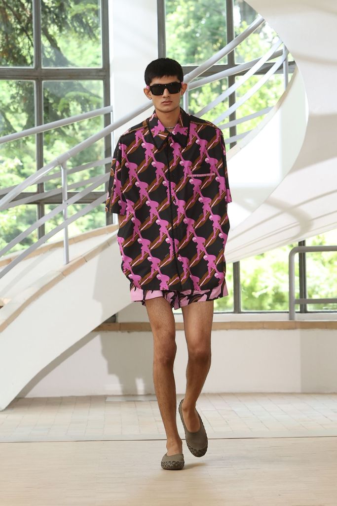 Utility and practicality were central themes throughout the collection, with zip jackets and leather coats featuring exaggerated openings and distinctive textures, infusing a modern edge. Each piece was crafted for both style and function, mirroring the dynamic lifestyles of urban adventurers and beach lovers. Surf influences, subtly abstracted, were woven throughout the collection, particularly in the detailed printed shirts. These shirts were adorned with embroidered fringes, beads, and applied flowers, showcasing prints of surfers, dolphins, hibiscus flowers, and banana leaves, while maintaining a structure inspired by utility wear. This blend of practicality and surf aesthetics created a vibrant tableau of adventure and relaxation. Embroidery played a significant role in the collection, adding an artistic dimension. Handcrafted long-sleeve polos featured sequin inlays, and sherbet-colored jackets sparkled with bead fringes that moved like waves, celebrating both the craftsmanship and the designer’s narrative.