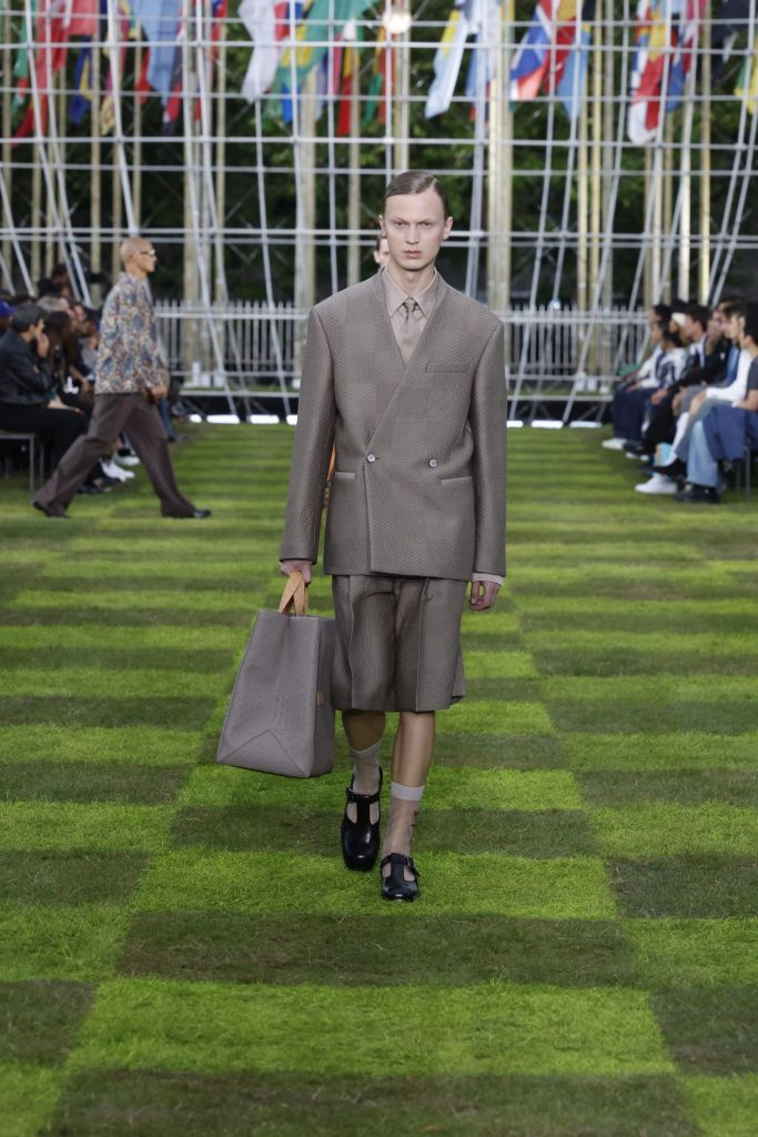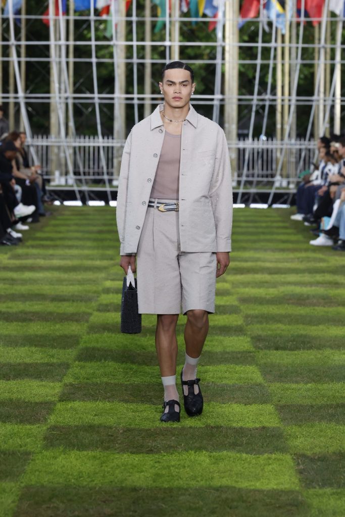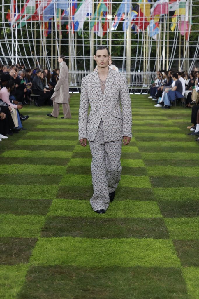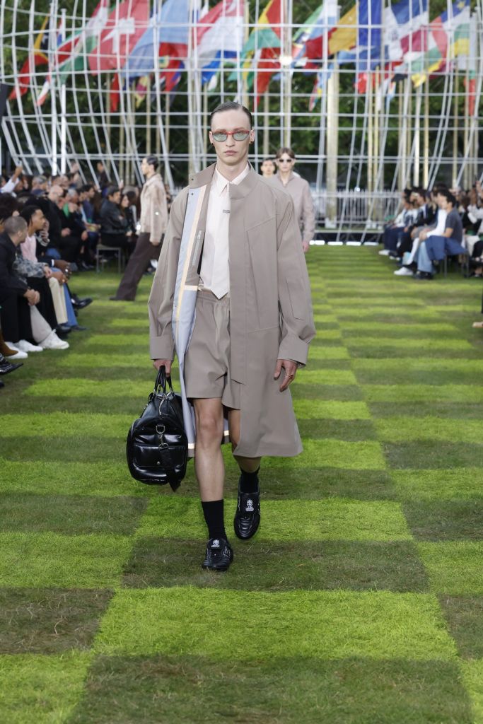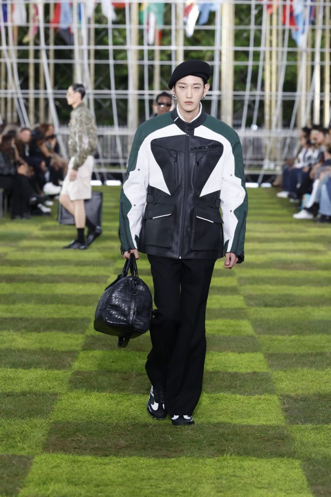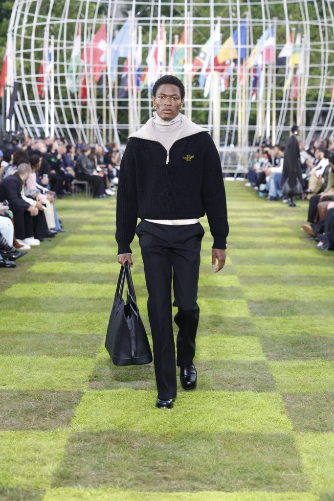 The collection, echoing the “around the world” theme akin to the Daft Punk song, embraces a similar structured approach. It unfolds like a geometric progression, starting with the intent to reflect the diverse skin tones of people globally. This is manifested through a color palette that transitions from black to lighter shades, ultimately culminating in a series of vibrant, multicolored jackets. The menswear lines are organized by archetypes of modern travelers, representing current menswear trends: formalwear for diplomats, military-inspired clothing for pilots, sportswear for explorers, and workwear for tourists.
