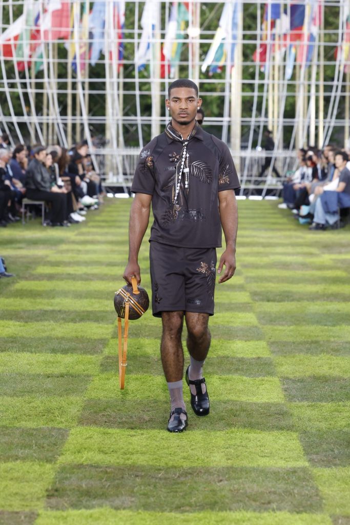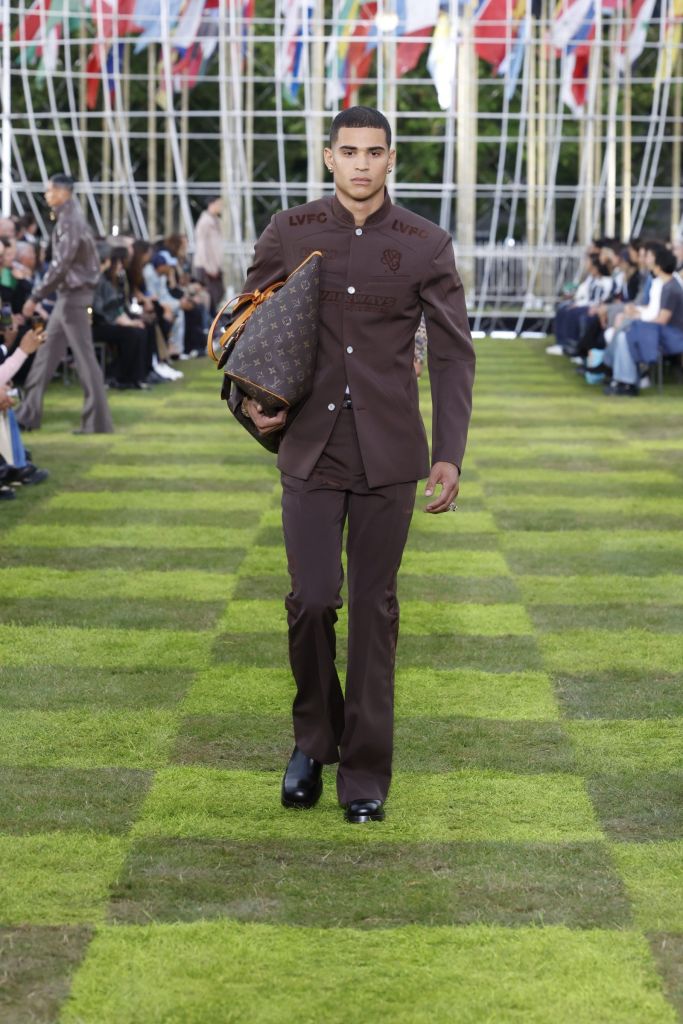 Collaborations with the Parisian artistic collective Air Afrique introduced designs featuring bluish-green tartan and Damier checkers, embellished with planetary logo tags. The collection’s footwear drew inspiration from various traveler archetypes. The LV Agent boot, Diplomat shoe, and Bowling shoe were designed to cater to different traveler styles, including a cowboy boot crafted from exotic leathers. Sporty influences were evident in the LV Footprint Runner and Soccer shoes.
