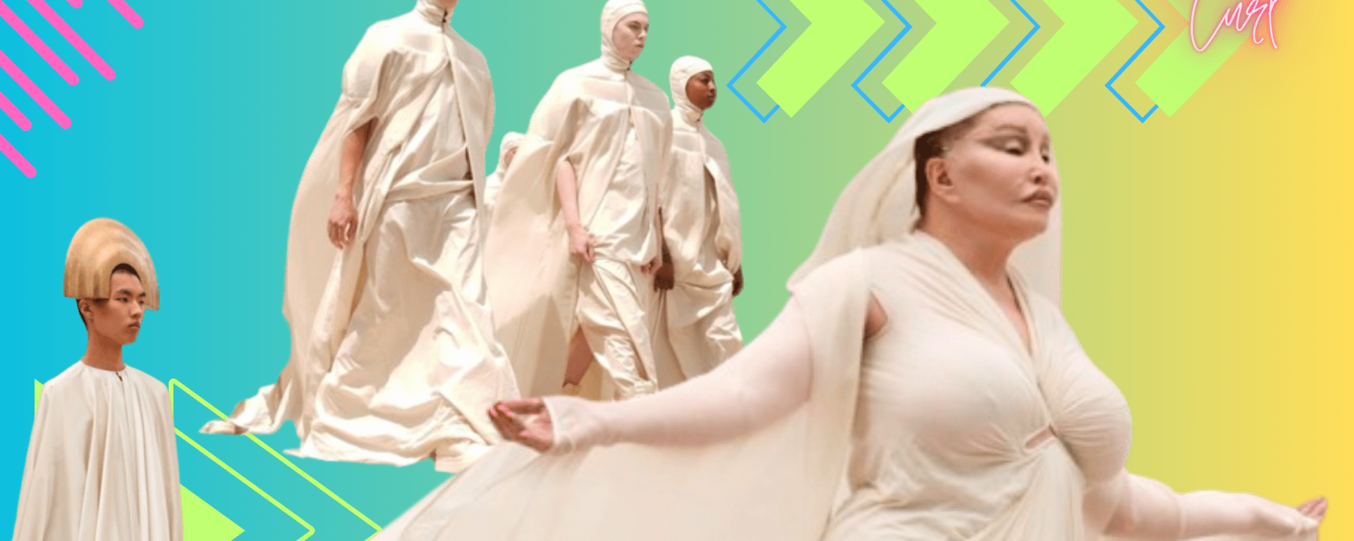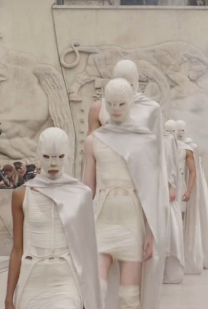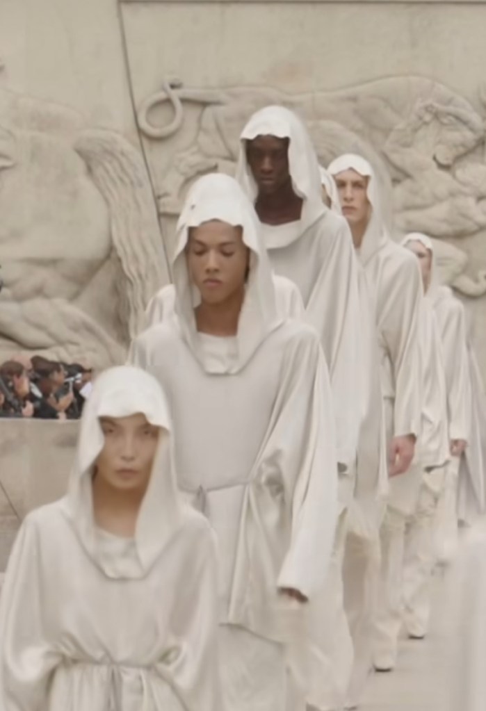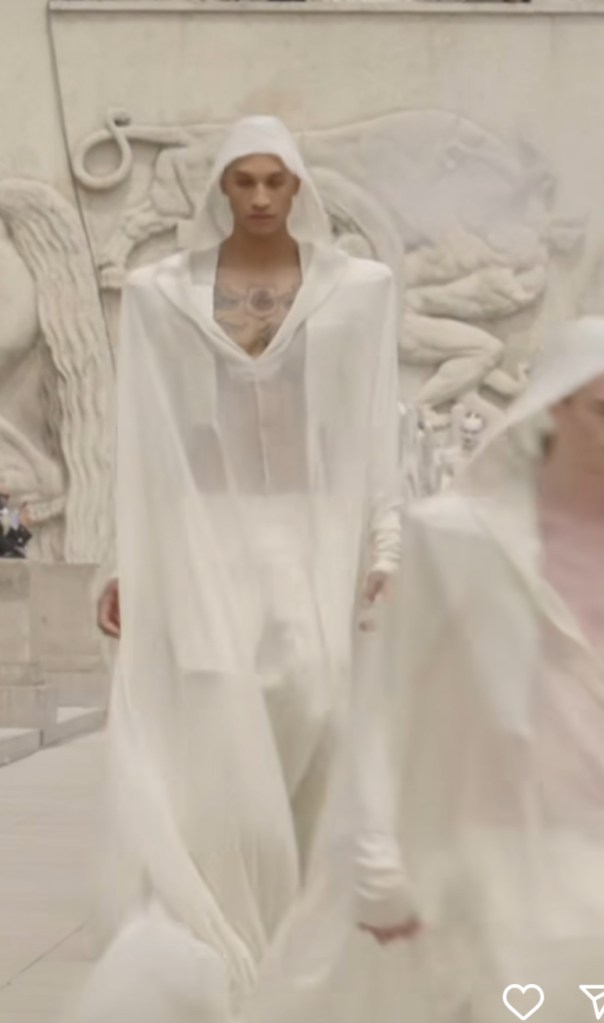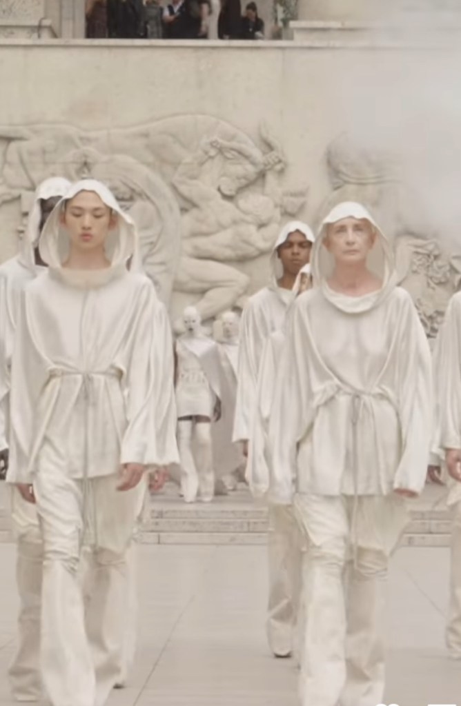 To manifest the diverse communities central to his show, Rick Owens enlisted students and faculty from Paris Fashion Schools. This “Army of Love in White Satin” also featured longtime collaborators like Jakob Jakobsson, who walked in Owens’ second New York show 22 years ago, and Allanah Starr, a prominent activist from the trans communities of New York and Paris. The extensive cast, uniformly dressed in white, included hoods, pants, bermudas, vegetable-tanned leather hooded jackets, and charmeuse garments from a collaboration with Dafne Balatsos’ brand Fina, all crowned with gold.