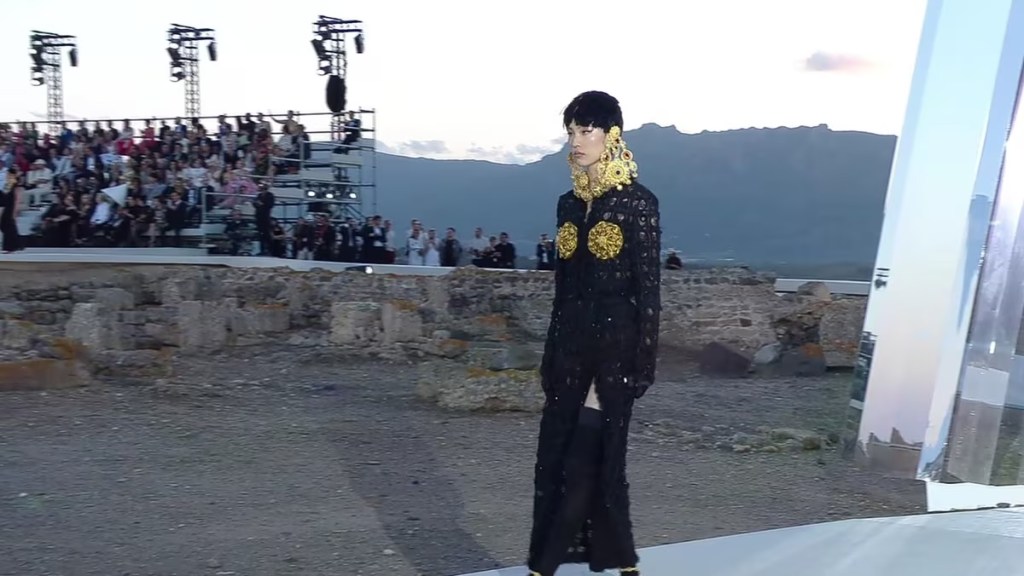 The fashion show took place amidst the ancient ruins of Nora, a significant Phoenician settlement. The site, with its sacred roads and mosaics, was protected with sandbags to preserve its integrity during the event. This respect for historical preservation highlights fashion’s potential to honor and integrate other forms of creativity.