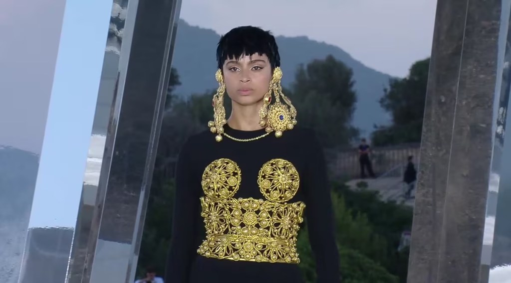 The Alta Moda 2024 collection features techniques inspired by Sardinian carpets and showcases garments in silk and chiffon. The collection’s primary attribute is movement, achieved through ‘drop’ cuts and gold-embellished corsets, harnesses, and bras. This nod to the brand’s 1990s innovations underscores their enduring influence on contemporary fashion.