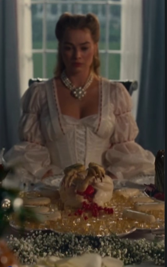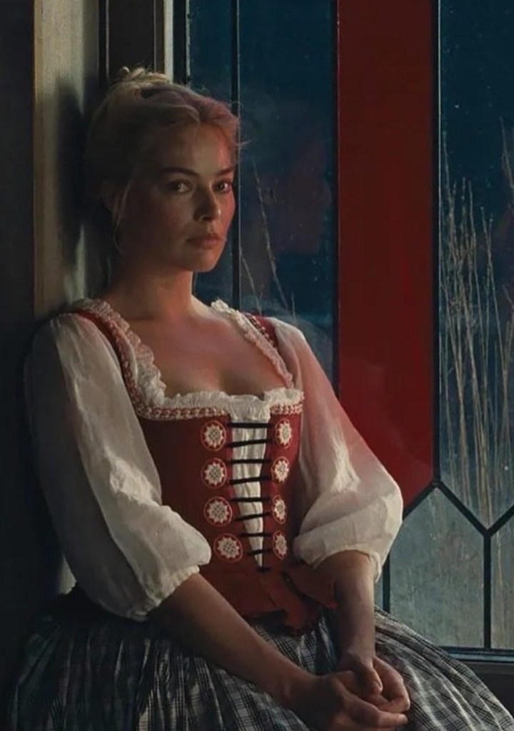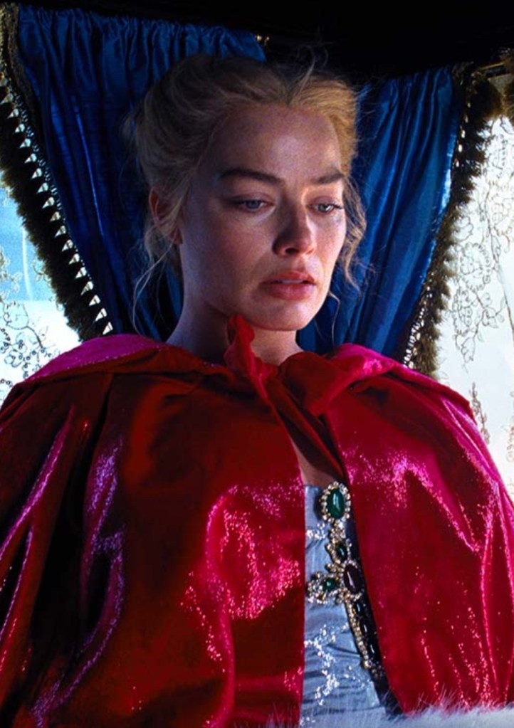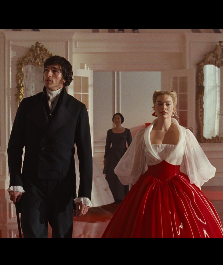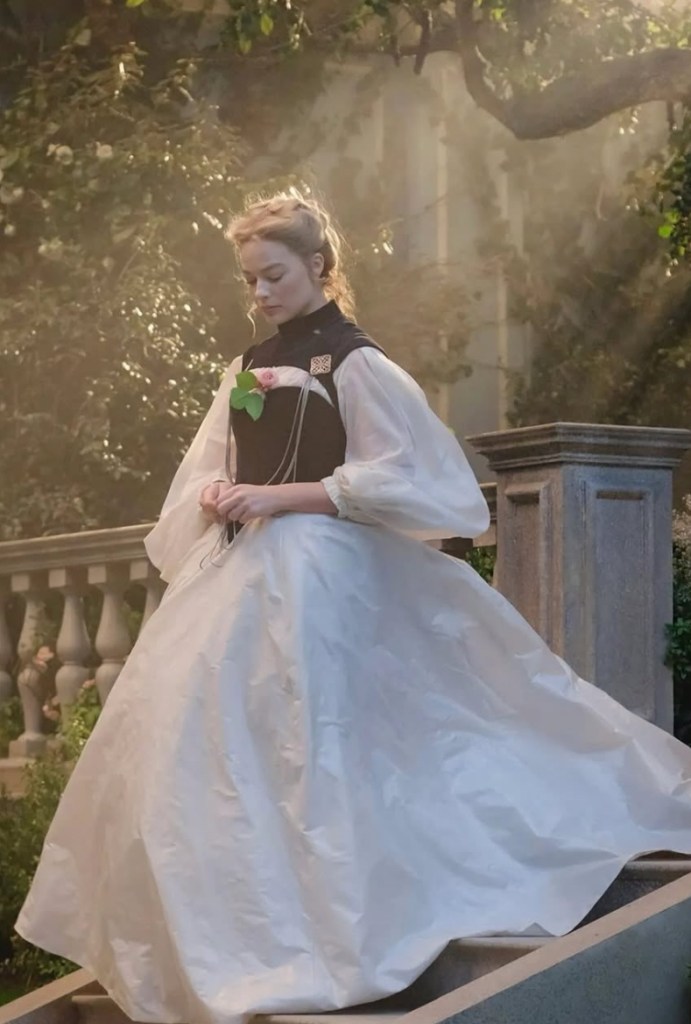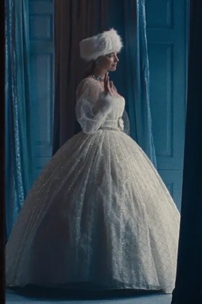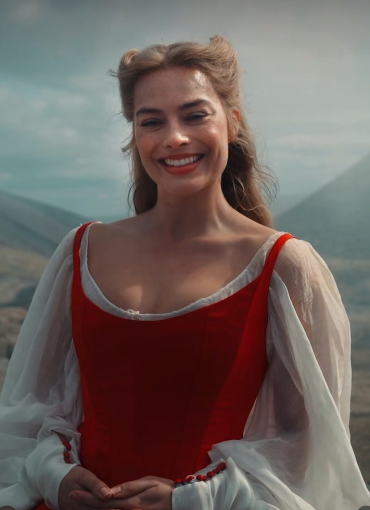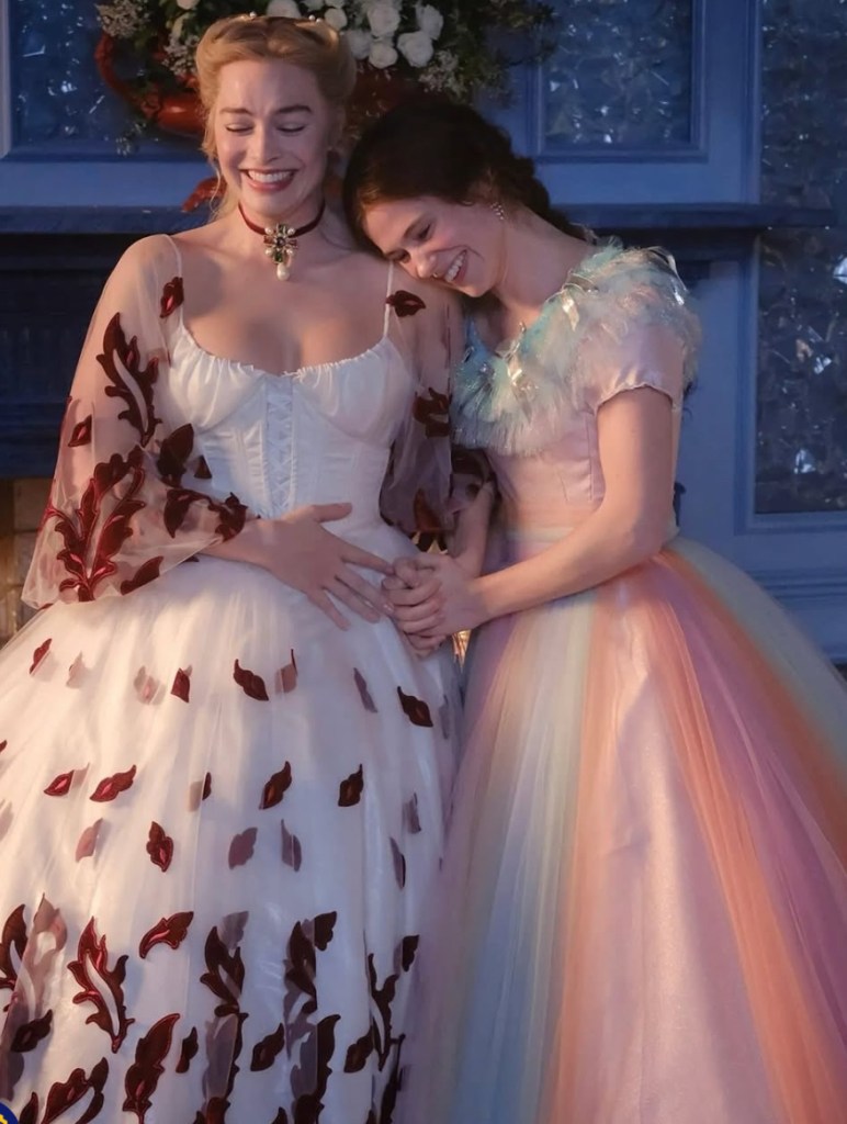 The first thing viewers notice is Margot Robbie’s wardrobe. Gone are the historically accurate Victorian dresses and muted color palettes. Instead, Robbie wears over 50 custom-made outfits inspired by an eclectic mix of eras and styles. Think Princess Sissi portraits, Scarlett O’Hara’s sweeping drama, 90s Mugler couture, early-2000s Dolce & Gabbana runway extravagance, and even PVC-wrapped pin-up editorials.